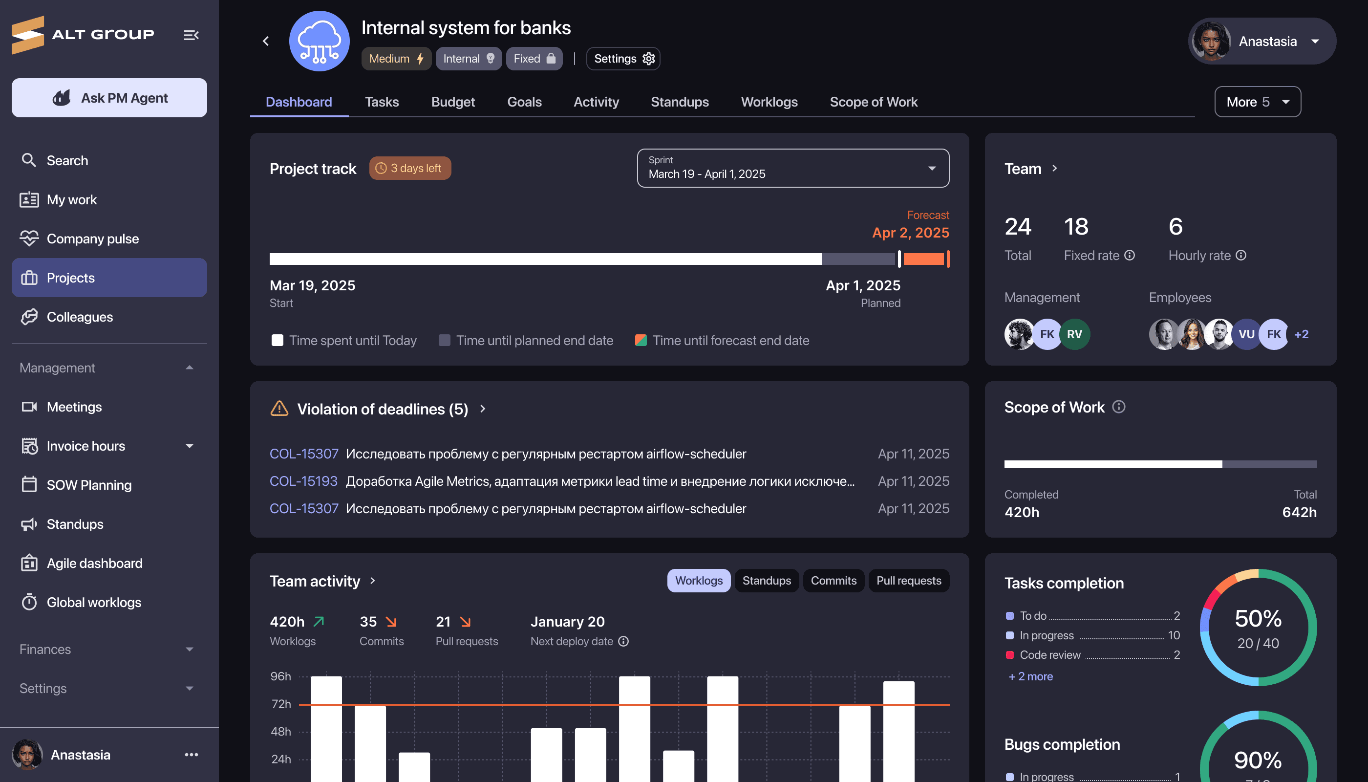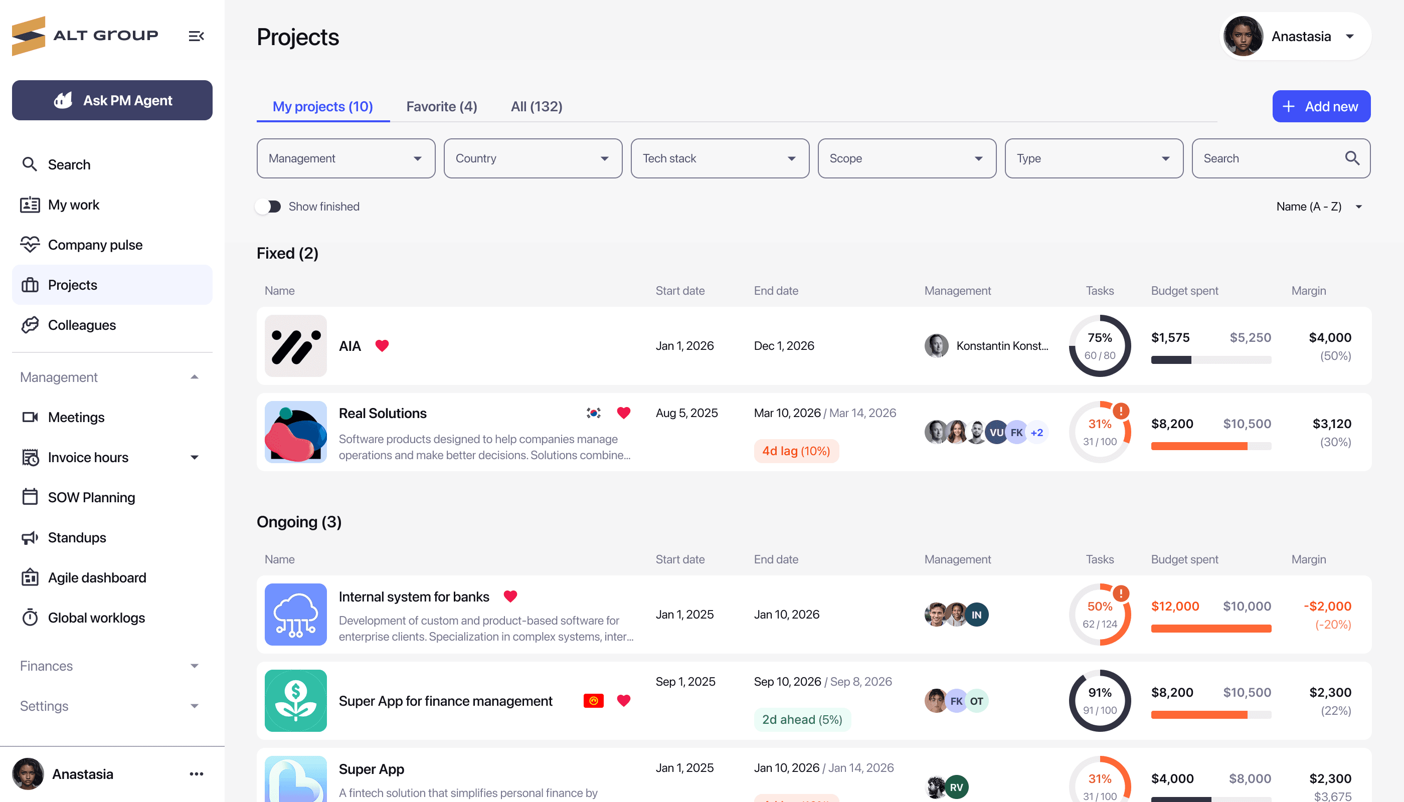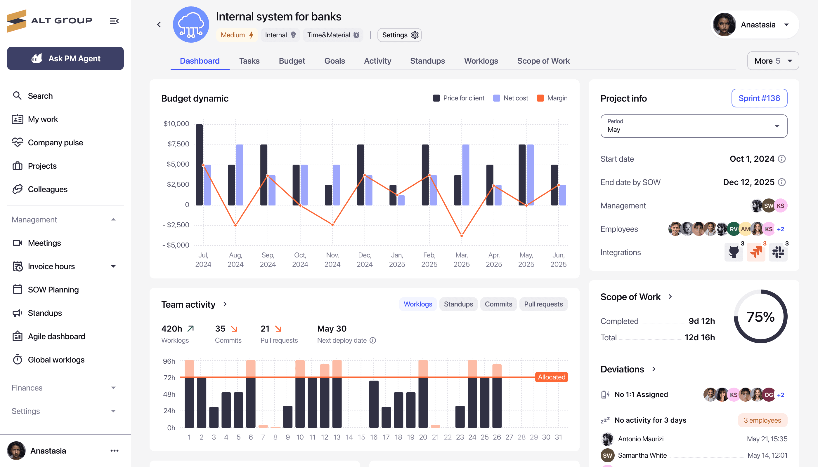 A delivery intelligence platform for remote and hybrid teams. Combines AI agent, real-time dashboards, and cost transparency to turn raw project data into actionable decisions — without manual reporting or excessive meetings.