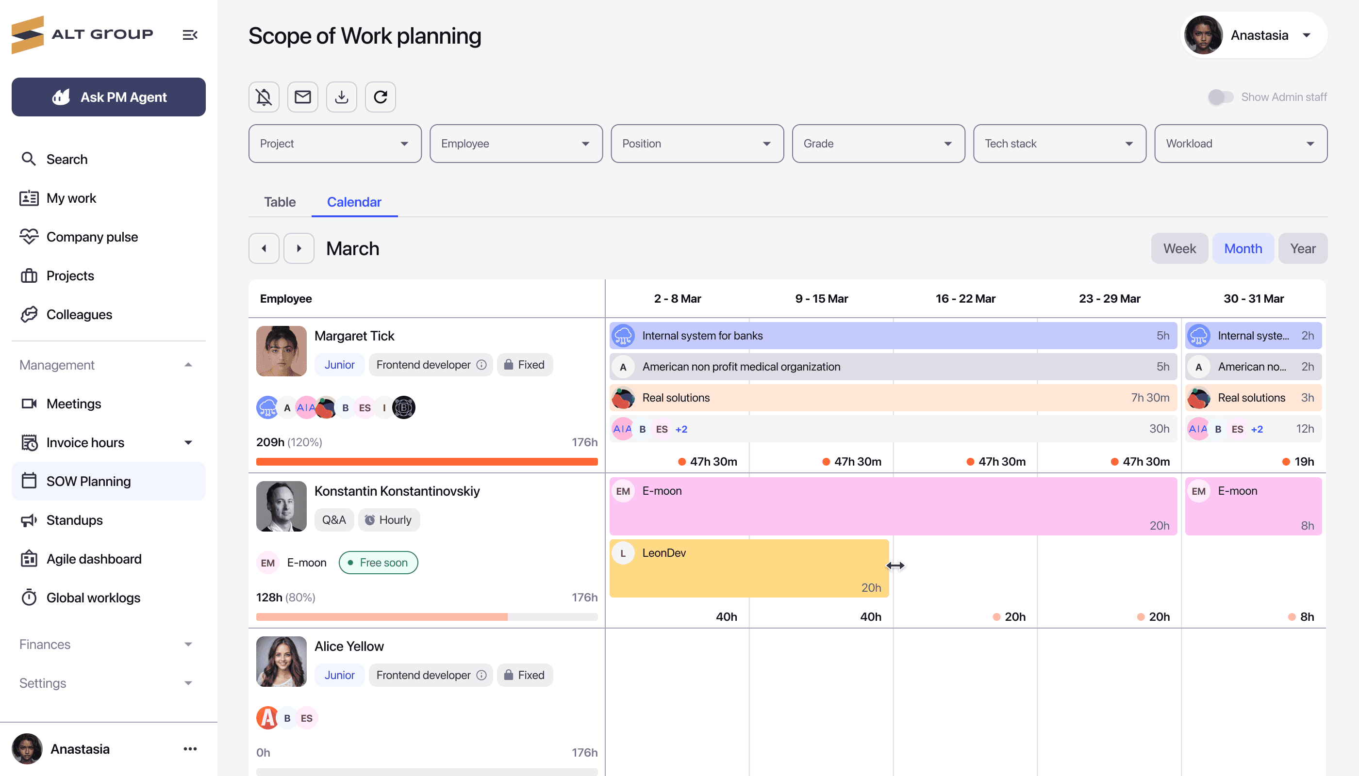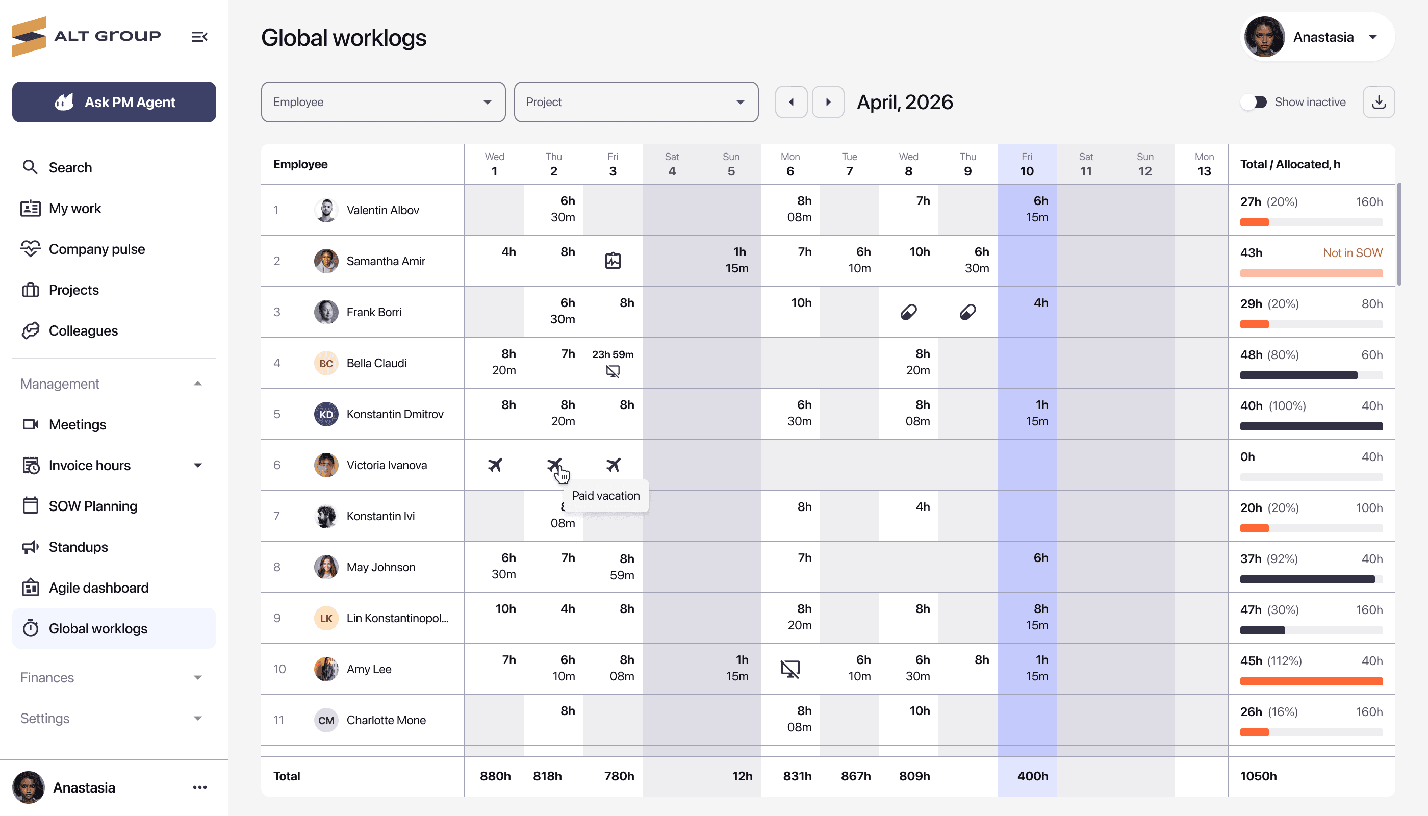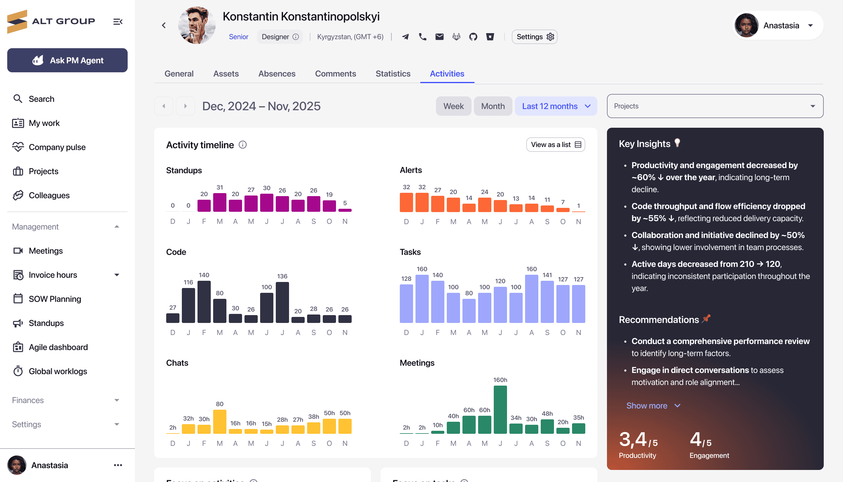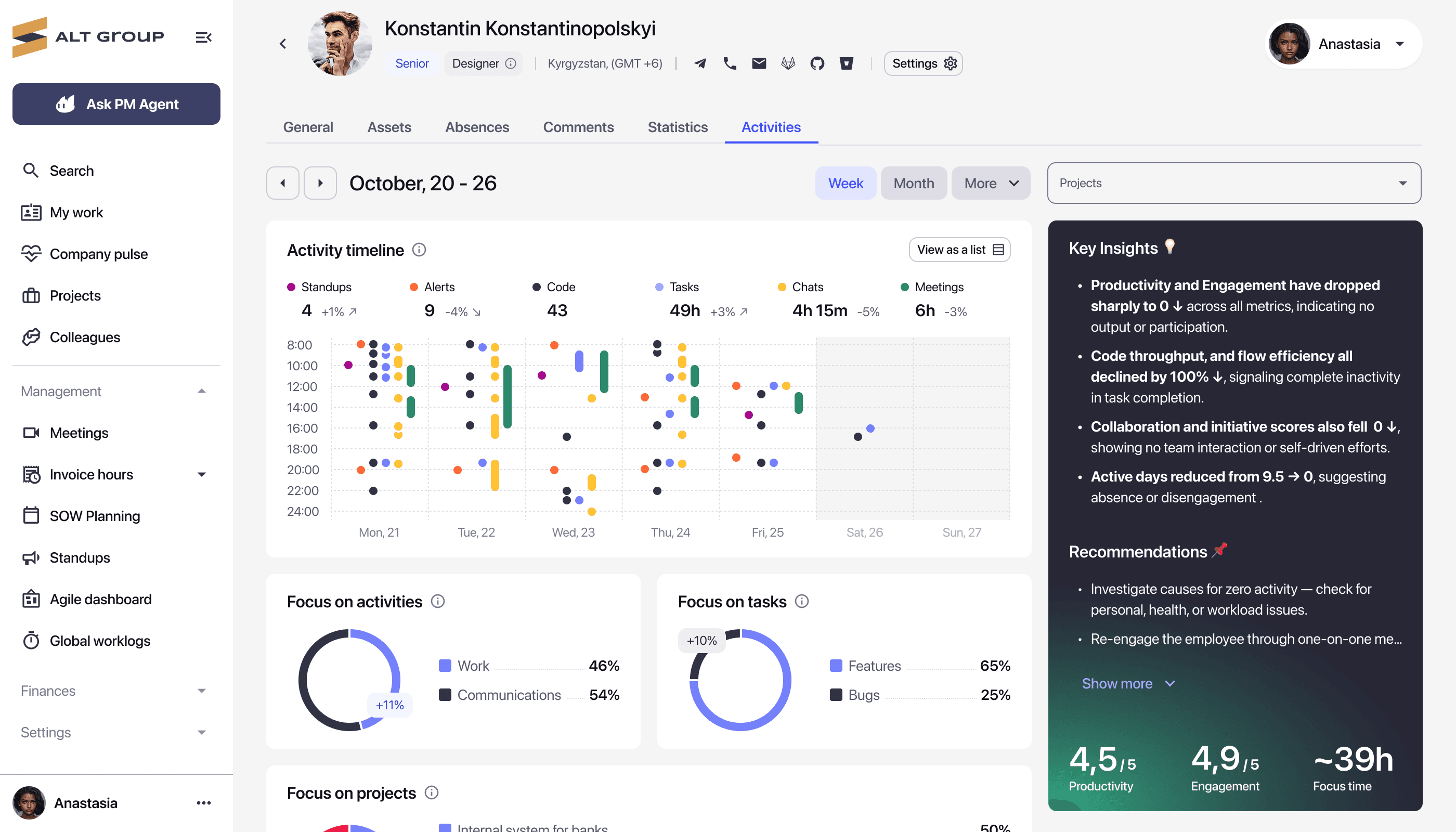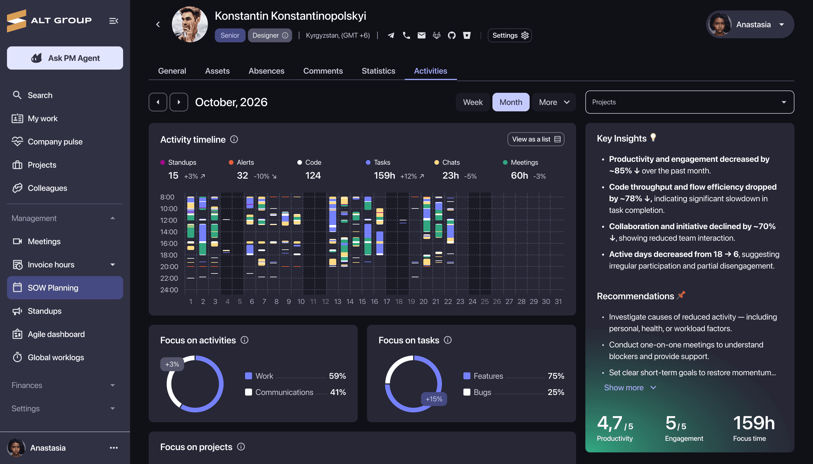 Designed a deep-dive view of how individuals and teams actually spend their time — broken down by work type, project, and task category. Metrics adapt to role: development vs. communication time for engineers, meetings vs. documentation for managers. A detailed list view allows drill-down into any activity for anomaly investigation or reporting. Helps managers spot overload and inefficiencies before they become problems.