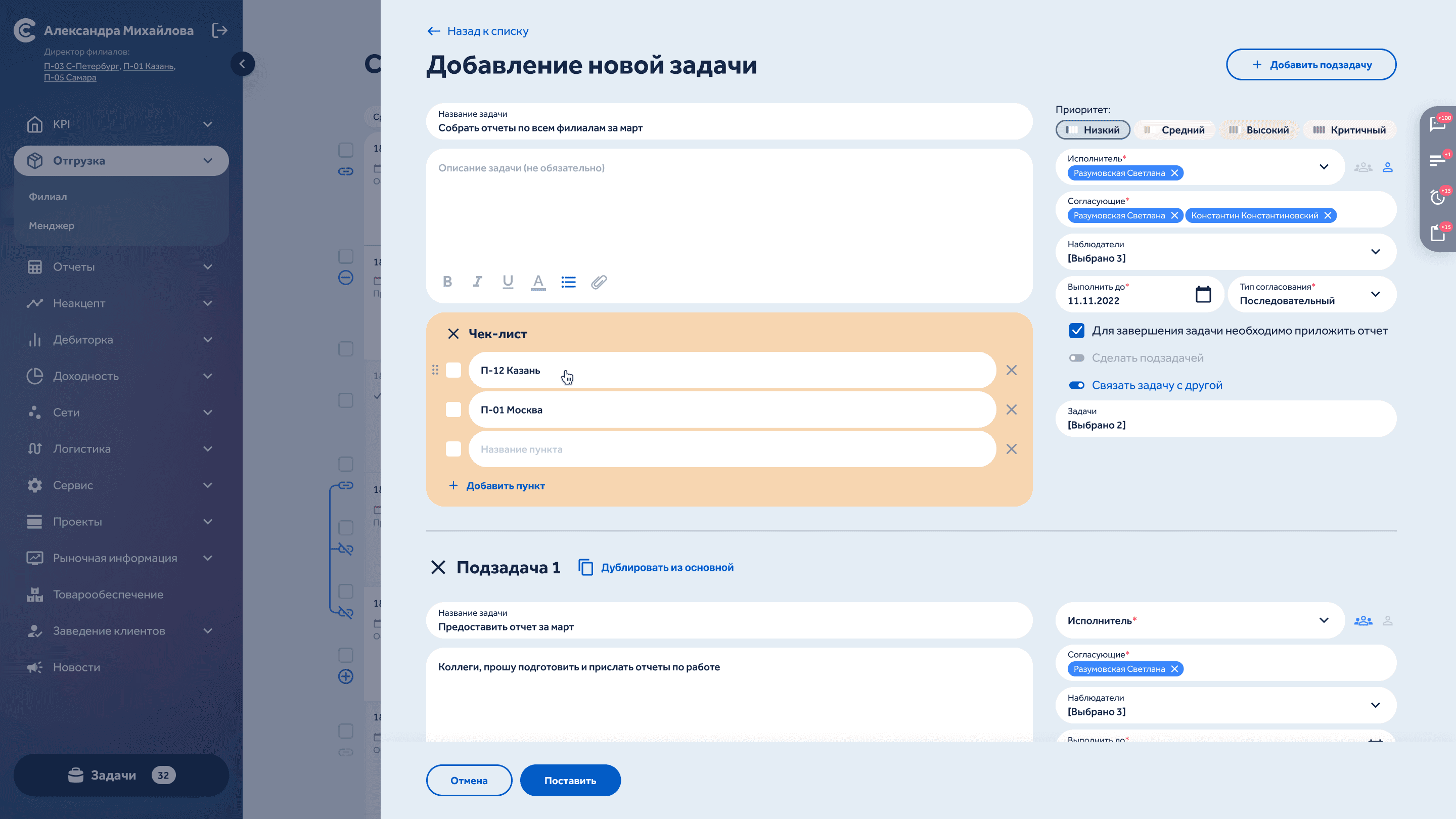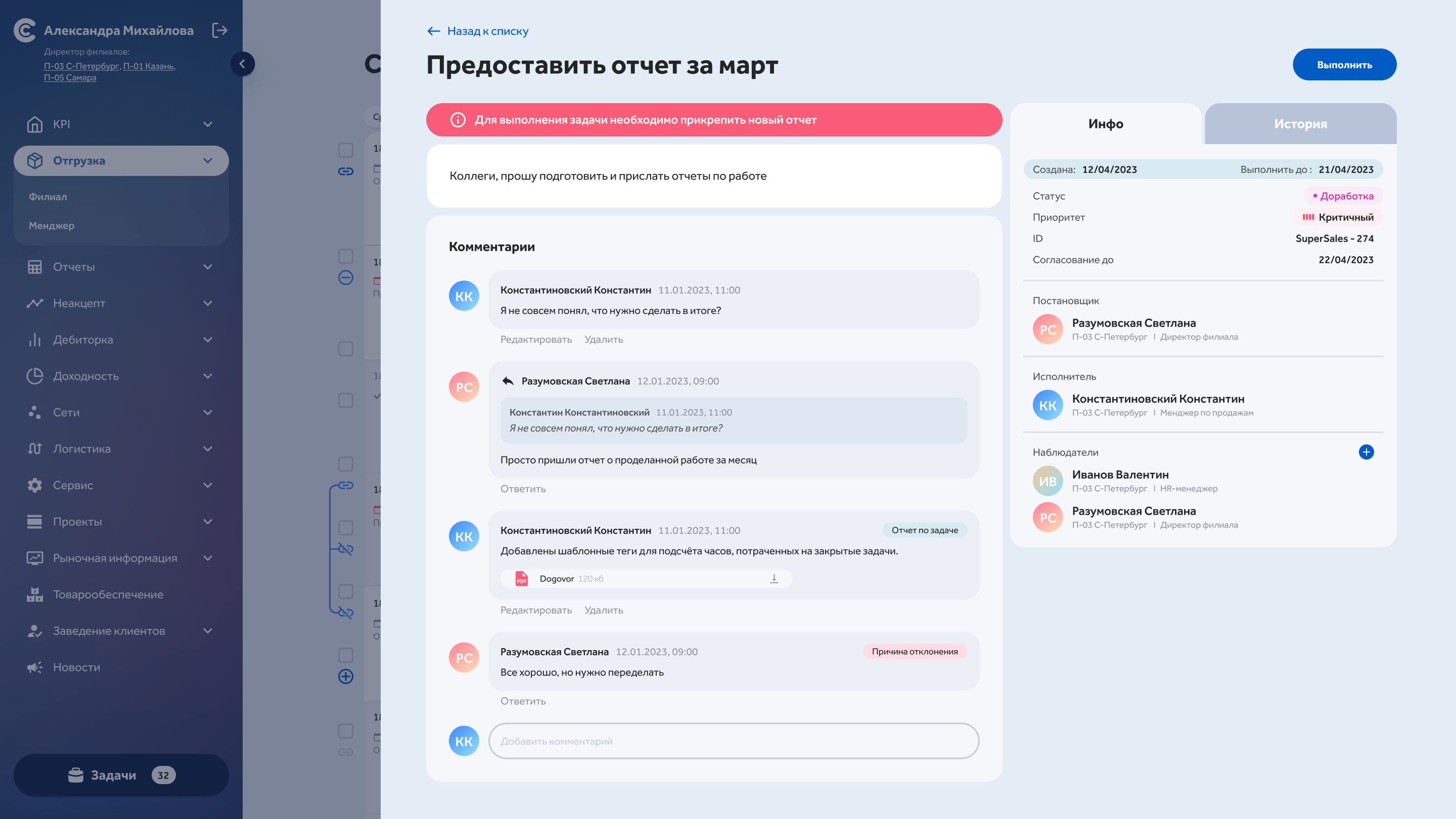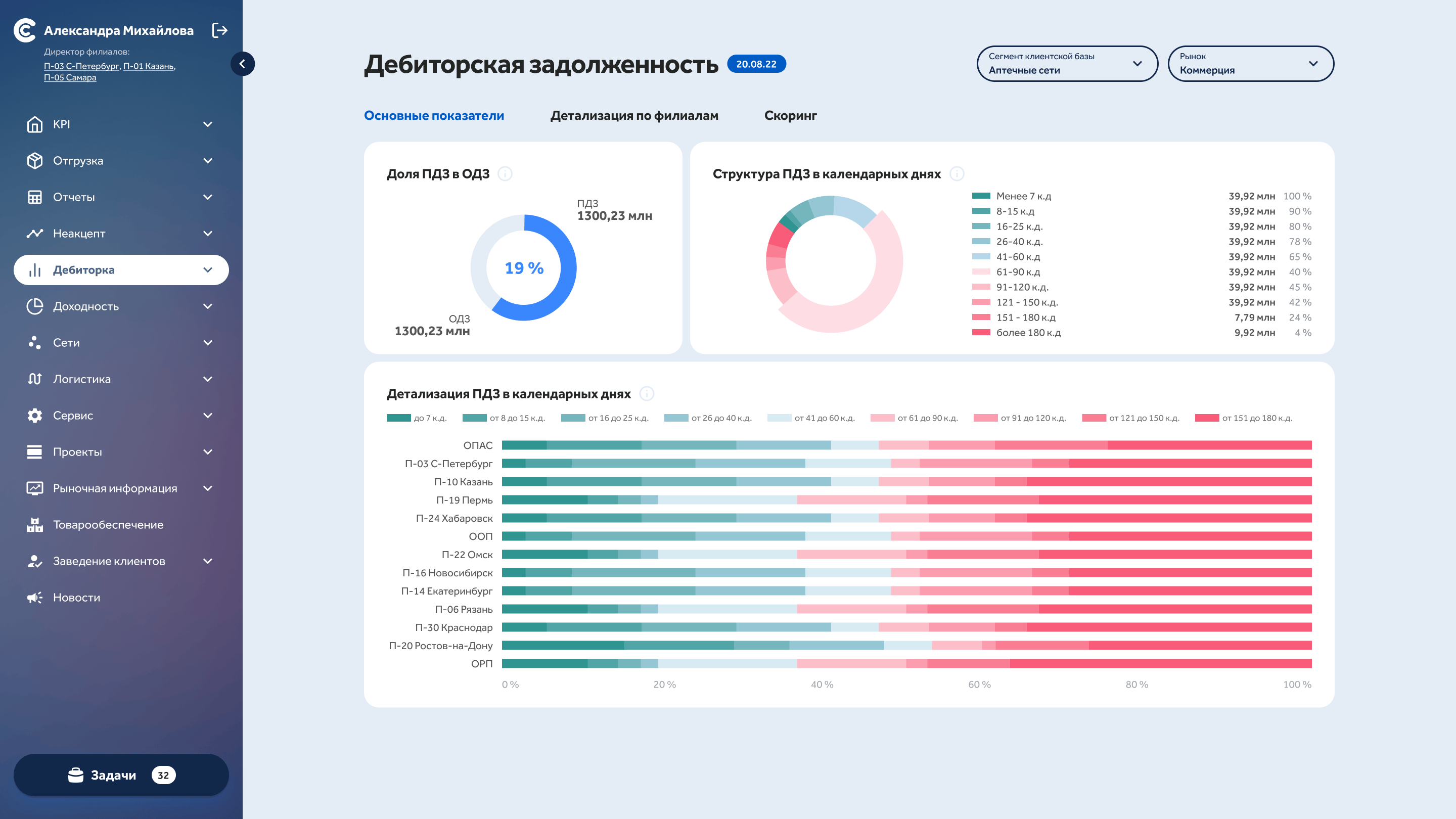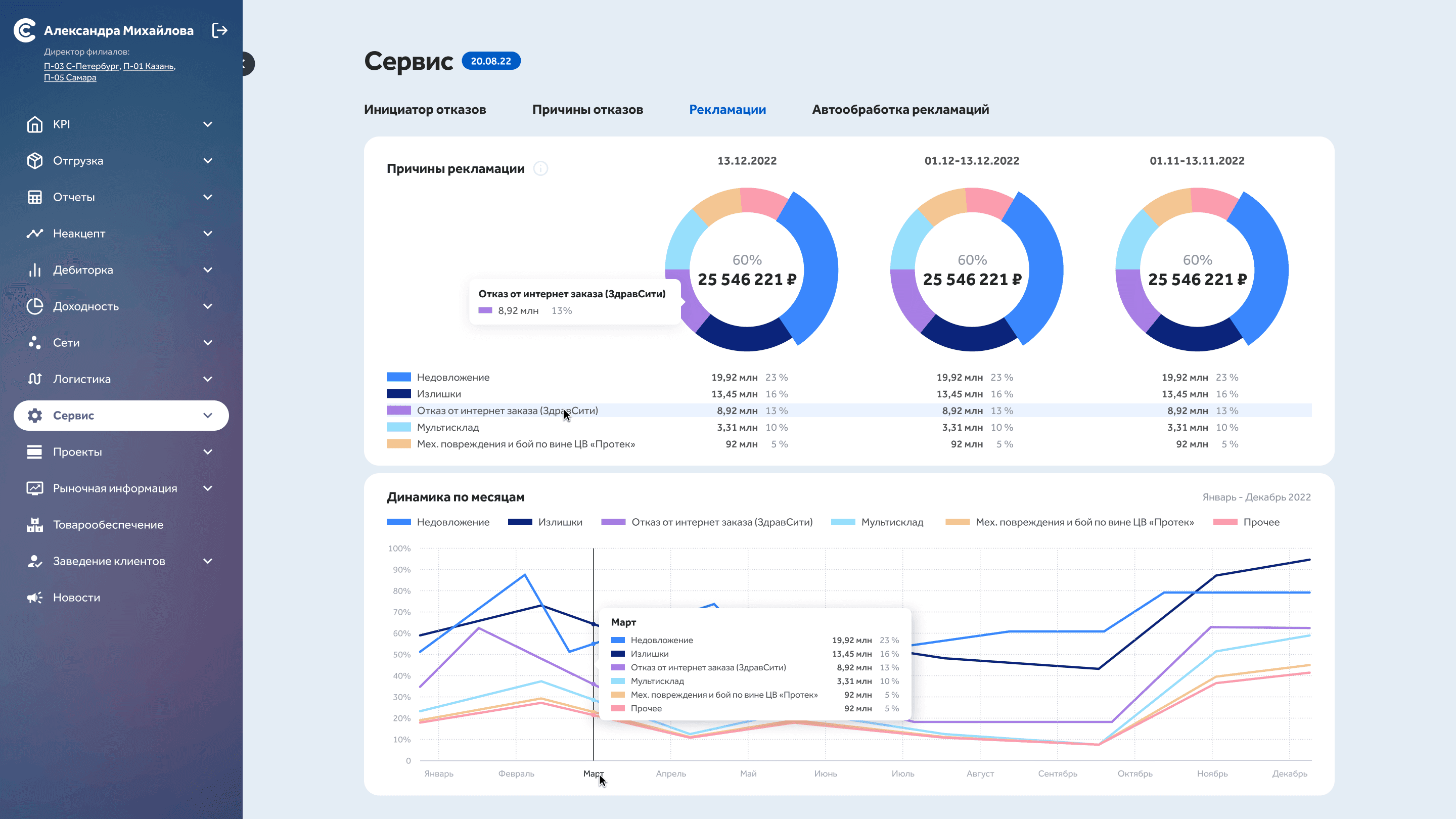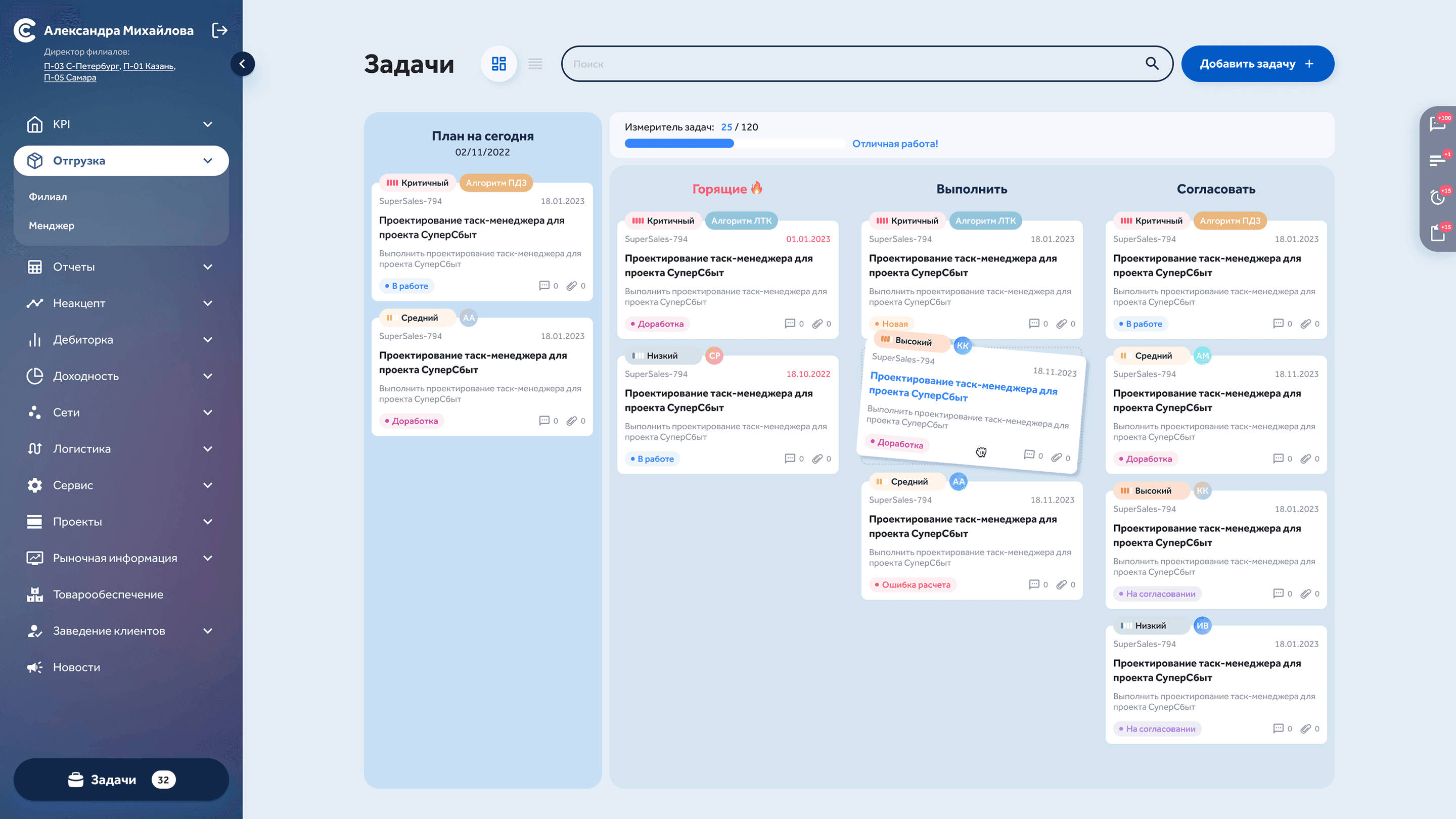 Designed role-based dashboards with graphical visualisation of key metrics across sales, logistics, and management divisions. When indicators hit critical thresholds, the system automatically creates tasks for responsible employees — turning a passive monitoring tool into an active response system.